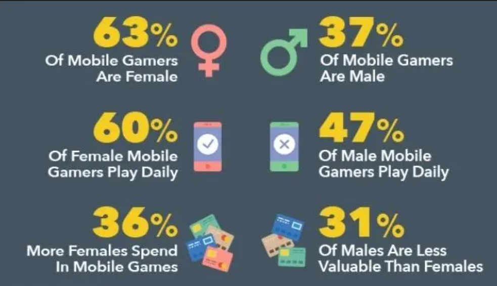 据mediakix数据,在如今全球手游市场上,约63%的手游玩家是女性,男性玩家占比下滑至37%。并且,这群女性玩家中,每日玩手游的占比超过60%,愿意为手游付费的比例也达到36%。相比而言,男性玩家每日玩手游的占比47%,只有31%的男性玩家愿意为手游付费。