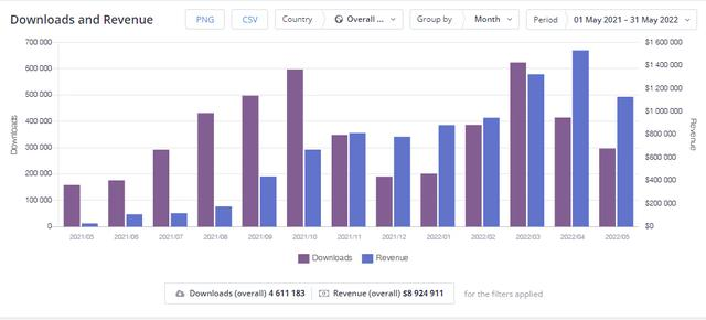 对于手游来说,最核心的两个KPI就是下载量和收入,在Google Play平台,《King’s Choice》自发布以来的下载量超过460万次、累计收入接近900万美元。峰值下载量出现在2022年3月份(当月下载超过60万次),随后在4月份迎来收入峰值(当月收入150万美元)。